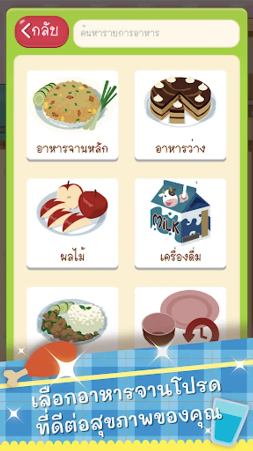 Game-based applications to promote nutrition learning And diet planning suitable for gender and age In the application, players will know about body proportions. The amount of energy from food and water that is right for you in 1 day. Including diet plans to suit yourself. And also having fun playing games to win prizes