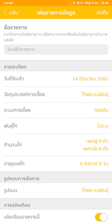 In recent years, the development of mobile applications for agricultural has become the most common way of providing a service to agricultural consultants and support tools educational materials. Because the mobile application has a great feature that needs to be easy use and intuitive. The aim of this study to develop the mobile application for assisting farmers to make better management plan and sources of knowledge about Thai native chicken for developing and standardize the production system from the farm level. Due to the recording of operational information is a key step in farm management, health impacts, productivity and disease control. Application development uses an Android Studio program, Kotlin language and a Firebase program for database management system. Main features of this application include management program, notification, history, management patterns, more information and contact us which designed to allow users to store and retrieve information easily and more convenient. The evaluation results of survey 30 users’ satisfaction on Thai native chicken farm management recording and warning system application showed that the average satisfaction score was 4.04 and the average standard deviation was 0.58 which means that user satisfaction at the high level. Available to be downloaded from Google Play Store and currently for use with Android phones only. In the future, our research will be extended to traceability system for creating standards of Thai native chicken farming system.