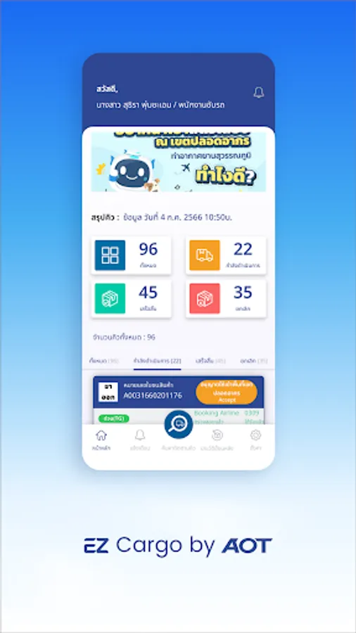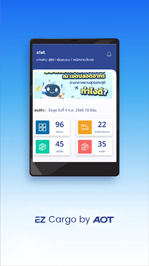 EZ Cargo by AOT เป็นแอปพลิเคชันสำหรับผู้ประกอบการที่เข้ามาใช้บริการในพื้นที่เขตปลอดอากรท่าอากาศยานสุวรรณภูมิ