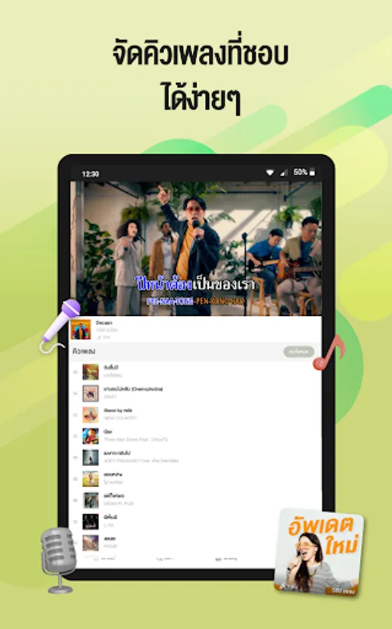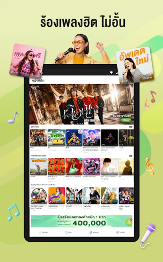 * ร้องเพลงฮิตทั้งเก่าและใหม่ที่ร้องกันได้แบบไม่จำกัดครอบคลุมเพลงหลายประเภท เพื่อค้นหาเพลงที่ร้องโดยศิลปินคนโปรดของคุณ ด้วยระบบค้นหาเพลงเพื่อช่วยคุณในการค้นหาเพลงคาราโอเกะสุดโปรดได้ง่ายๆ