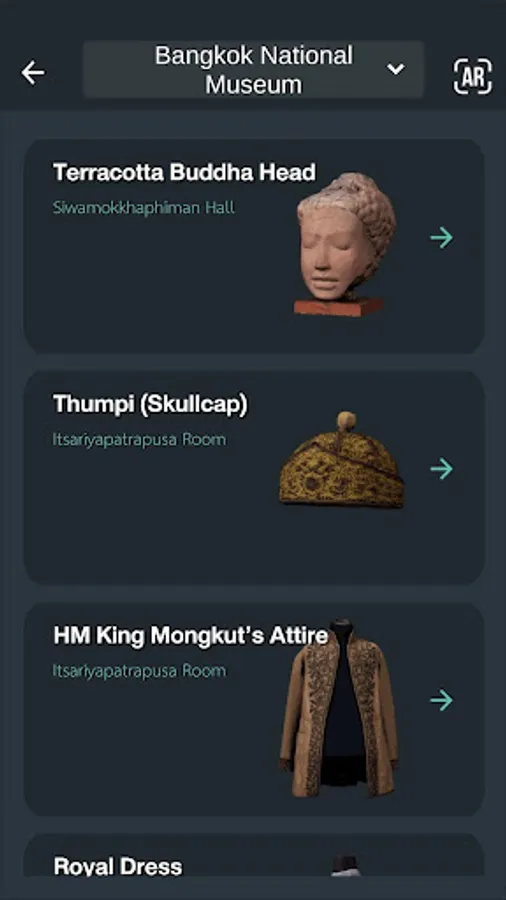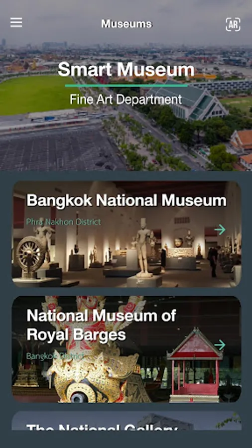 This is an application that improves National Museum touring experience to all who visit. Its content covers 4 main museums, namely, Bangkok National Museum, National Museum of Royal Barges, The National Gallery, and National Museum Silpa Bhirasri Memorial. With the aim of supporting multiple tourist nationalities, 4 Languages (English, Thai, Mandarin, Korean) are available for selection.