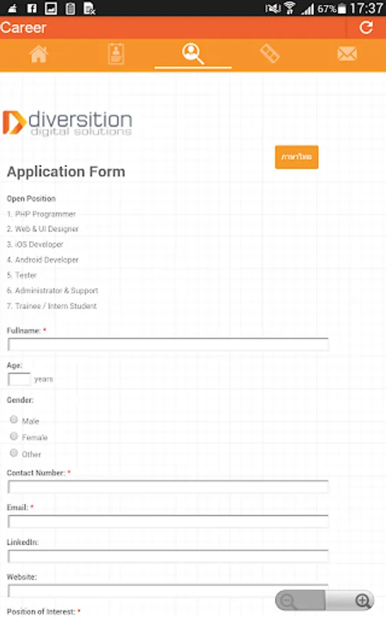 Diversition Application allows you to see more of Diversition Co., Ltd. and can contact us. Or a job with us. Without the need to visit the site. Making the unit more mobile applications.