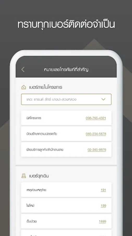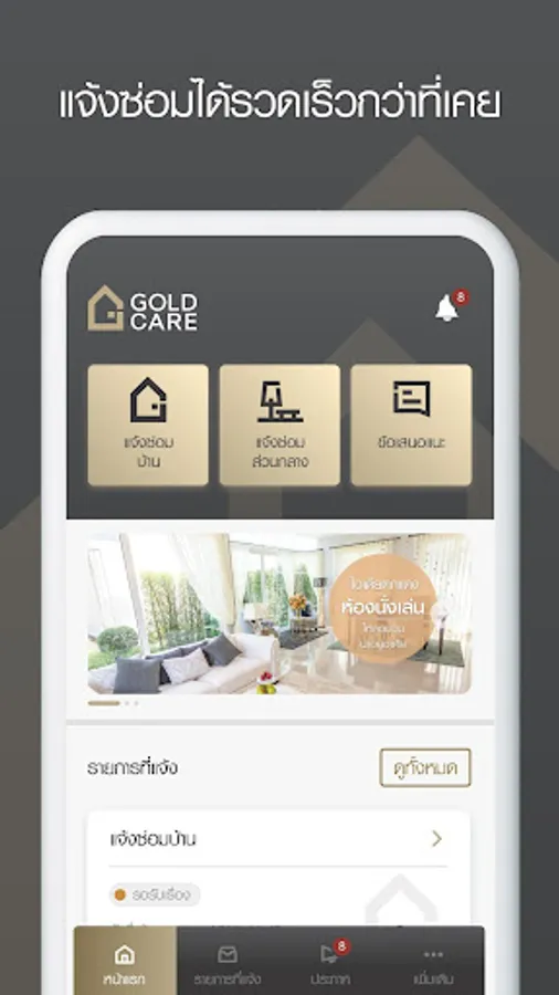 GOLDENLAND is committed to developing the best for our residents. In addition to the standard of housing construction After-sales service is always our top priority. GOLD CARE is created for greater care. Is the only application that is available anytime, anywhere. Whether to notify, repair, check status or follow news from the project Can be done easily and quickly And is a gift from the heart that is given to all the residents