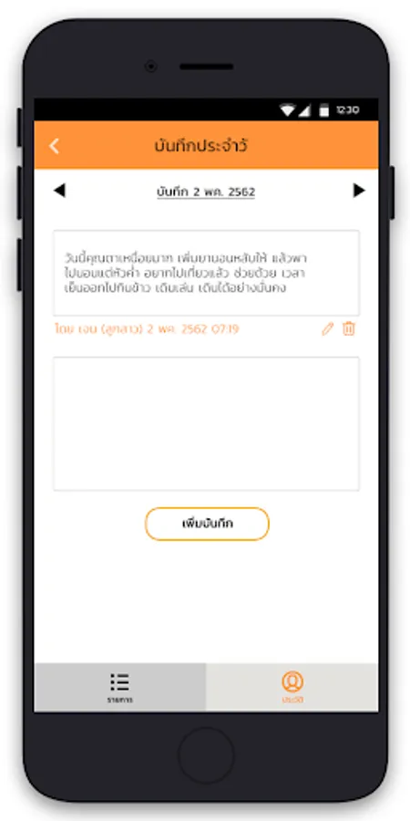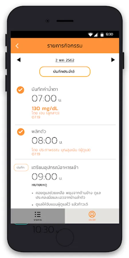 • Daily care list Is a list of activities that must be done on a daily basis that the administrator uses as a guideline for supervision Including being able to record a list of activities that have been done The application will display the name of the administrator and the time that the event