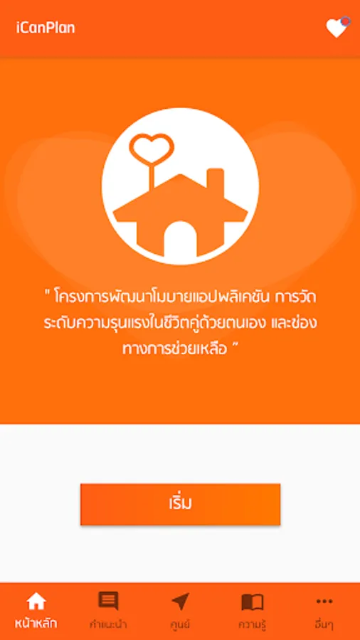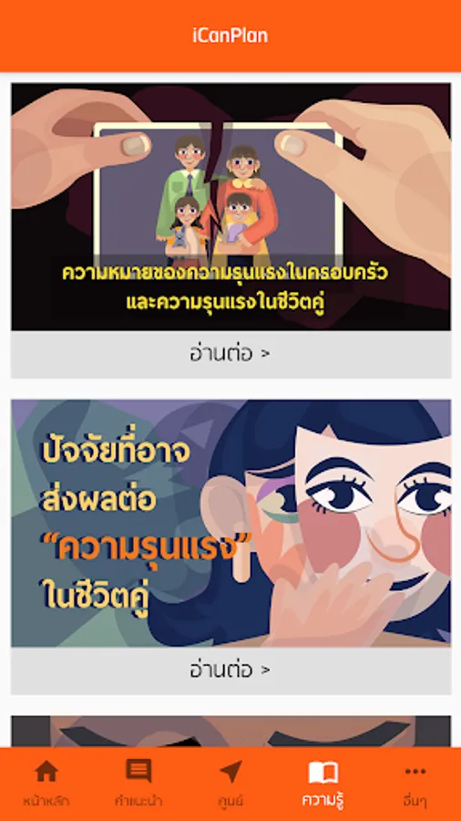 Violence in the family is a problem that should not be overlooked. Whether it is mental, physical, or sexual violence Can not deny that there are people who have problems in life, do not know how to help or counseling channels Research team from the College of Public Health Sciences Chulalongkorn University Therefore jointly developed an application for measuring relationships / violence in a couple's life (iCanPlan) and able to search for basic help channels in the region in which the user of the application resides Under the research project "Developing mobile applications, measuring the level of violence in self-life and self-help channels" (annual budget for the capital, 2018)