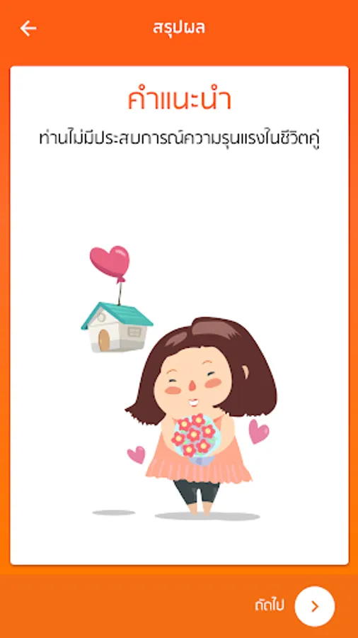 Relationship / violence in life It consists of 30 questions that cover physical, mental and sexual violence after successfully answering questions. Users will receive initial evaluation results and recommendations. Along with the initial search help channel However, those who will evaluate their relationship in their own lives are those who are 18 years of age or older and have a partner to eat or have a partner in the last 12 months. For the general public, can access the help channel without having to assess the relationship in a couple's life and or be able to read general knowledge about the violence in a couple's life.