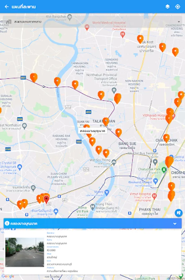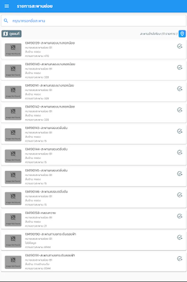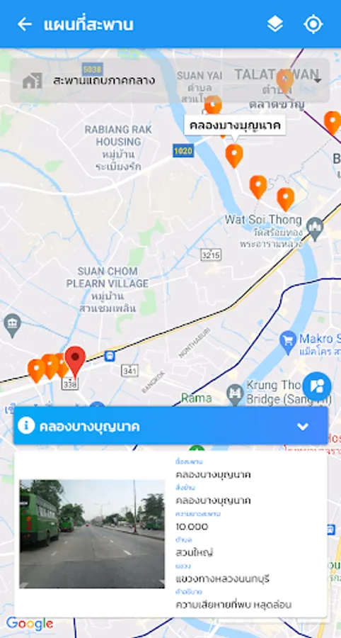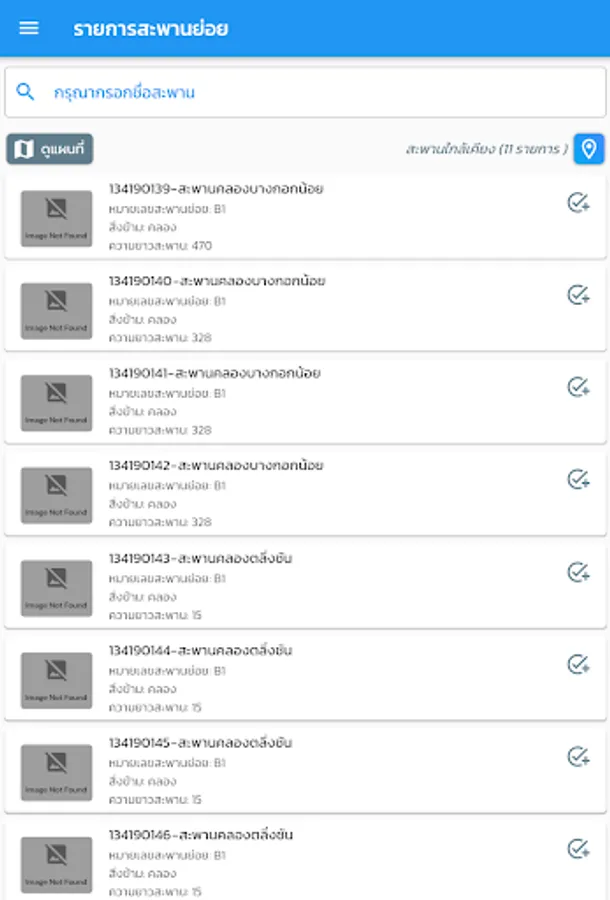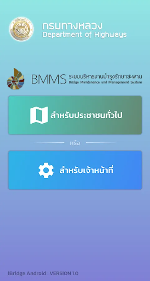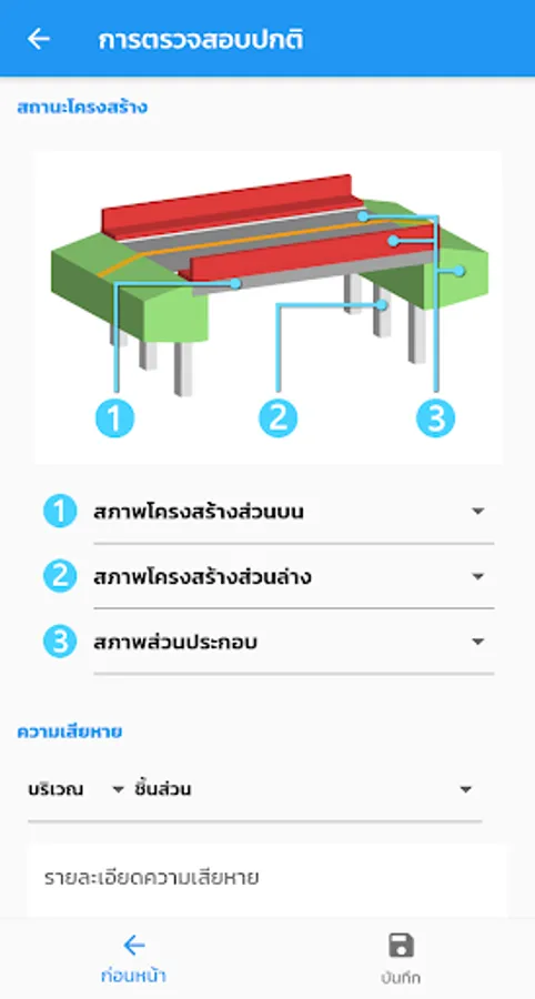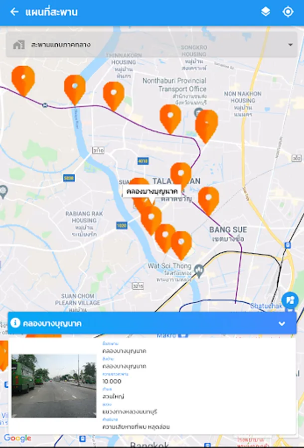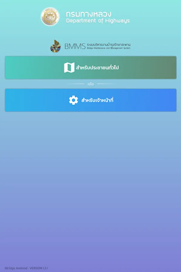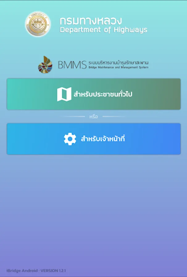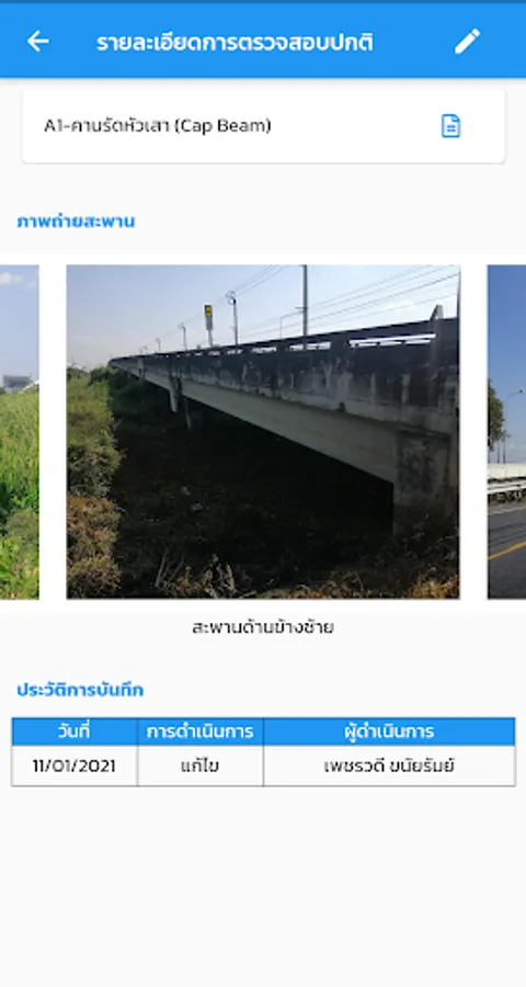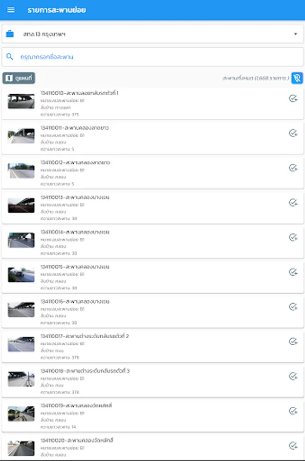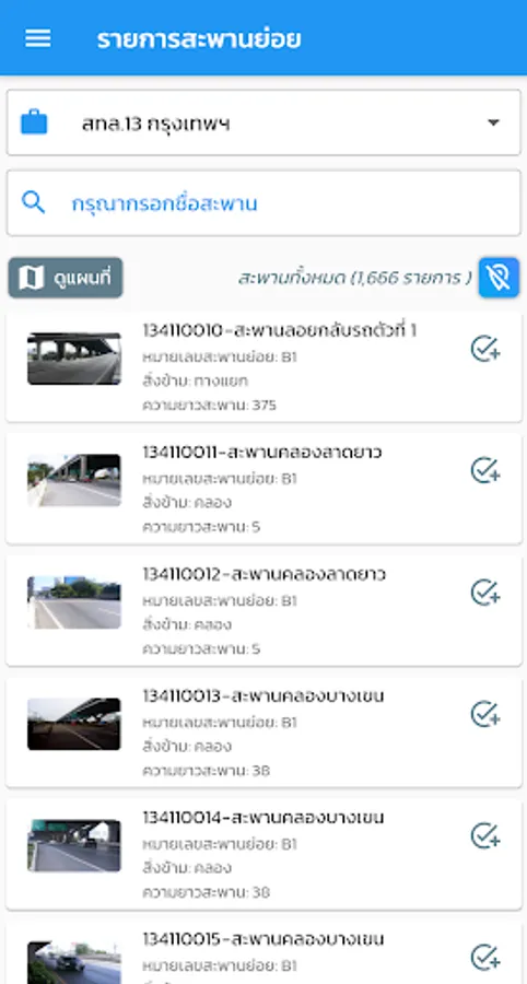 location display application and details of the bridge of the Department of Highways For the benefit of people traveling, the details of the bridge consist of a photograph of the bridge, the name of the crossing, the length of the bridge. Bureau of Highways responsible, etc., also help facilitate quickly to the bridge inspector to inspect the bridges by recording a photograph of the bridge Bridge Structure Status Points and details of the damage of the bridge from the area and components of the bridge as well