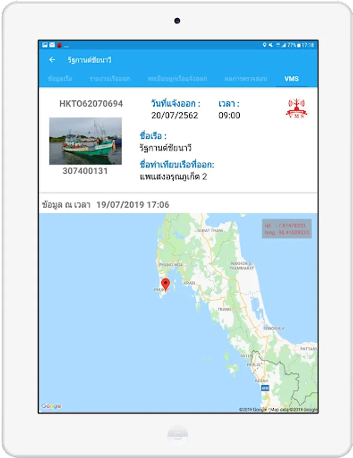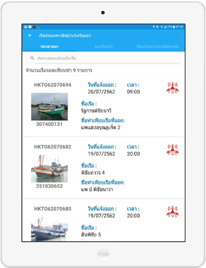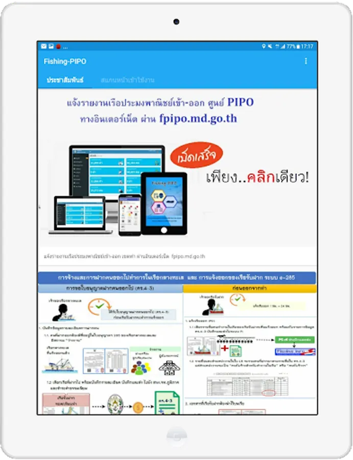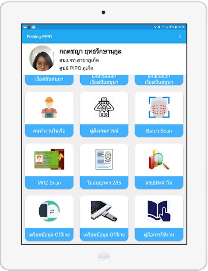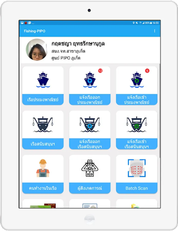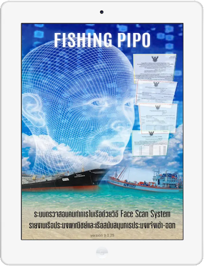 Fishing-PIPO is an application forThai fishing fleet to report the vessel’s movement and manning of crews on board which required permission and inspection to comply with Thai laws. The shipowner or charterer of fishing vessels can request or notify the government officials of pre-arrival(PI, port-in) and pre-departure(PO, port-out) of his/her vessels including other information for permission or inspection through this application and also automatically obtain port clearance when the permission is granted. The face scan technology is included in this application for user access and for government officials when inspect of the crew onboard by scanning face of the crews to promote safety and security at sea.