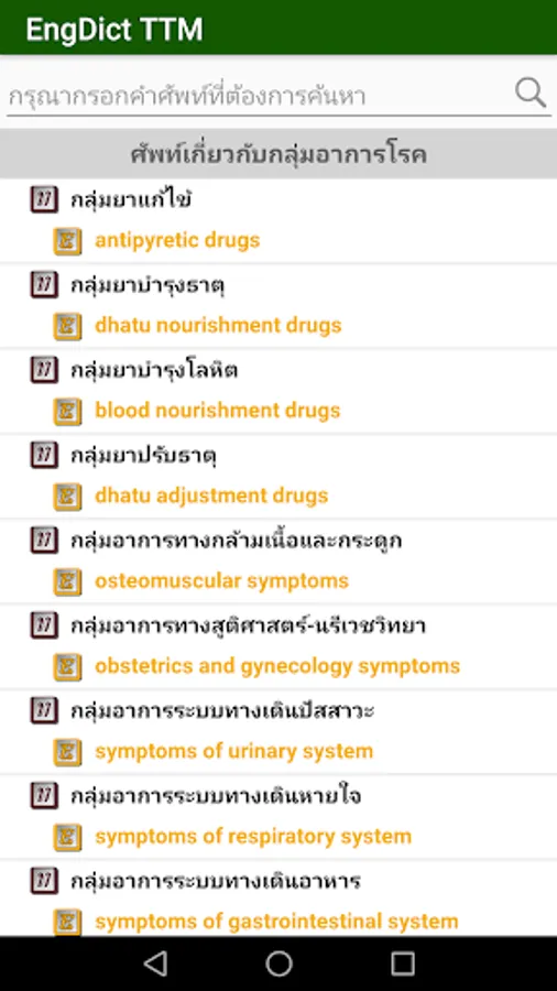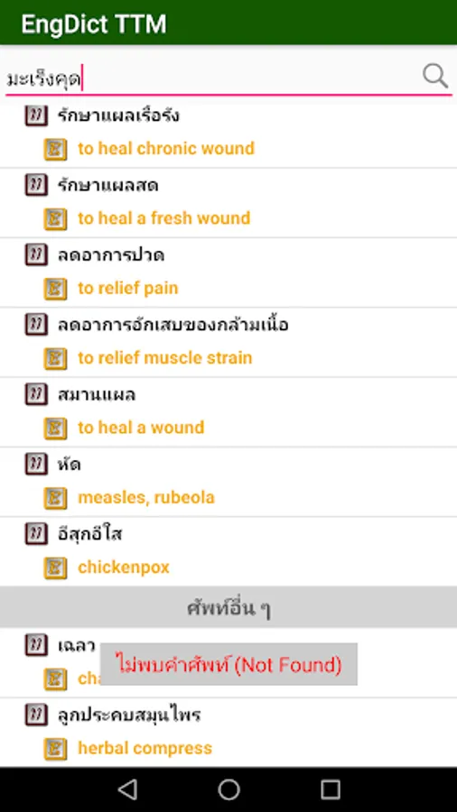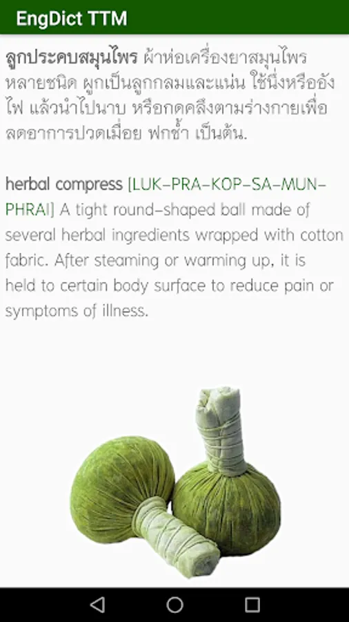 “English-Thai Dictionary of Thai Traditional Medicine” is created to help promote the understanding of the knowledge of Thai traditional medicine (TTM), Thai medicinal plants and Thai traditional medicine preparations and can be used as another reference of TTM for Thais and foreigners. The dictionary can assist in further searching for more information on TTM and Thai medicinal plants from Thai or English sources or websites. For local manufacturers of traditional medicinal products, the information provided will be useful for the preparation of documents for product registration and licensing.
