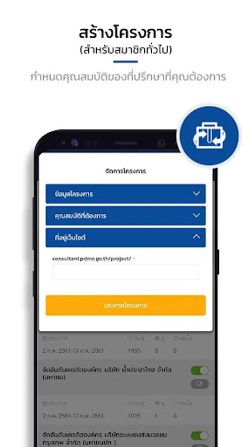 For advisors who are registered as members of the advisory council, information center. Access to the system User name and password In order to match that. The system displays the calculated results match the declared right to counsel. The advisor can view detailed project and expressed interest to submit projects. Search Consultants Search project announced And receive notifications of information from the data center consultant. Public Debt Management Office Ministry of Finance