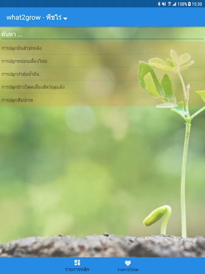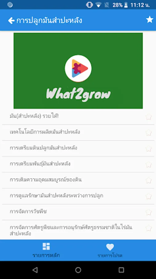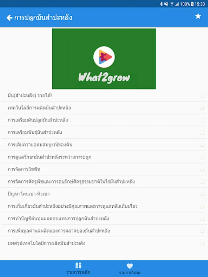 What2Grow TV is a mobile application under an integrated project to increase the efficiency of agricultural land use (What2Grow Project) by the National Electronics and Computer Technology Center. National Science and Technology Development Agency To be an alternative way to transfer knowledge on increasing the efficiency of crop cultivation or raising economic animals Focus on reducing costs, increasing productivity, being a center of agricultural knowledge of government agencies in agriculture, such as Department of Agriculture Department of Agricultural Extension, Department of Fisheries, Department of Livestock and Department of Mulberry Silk etc.