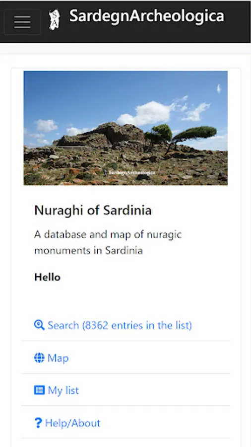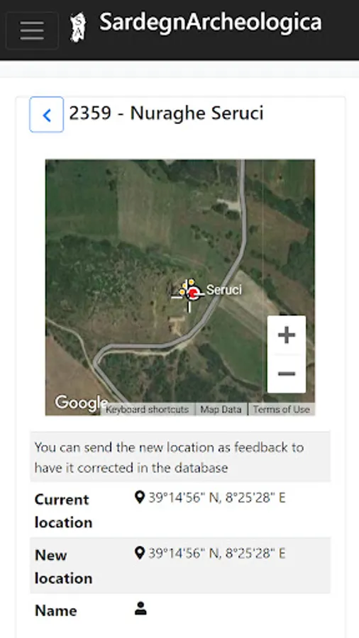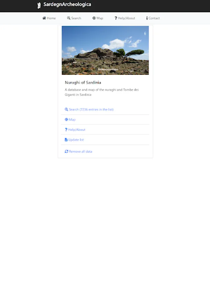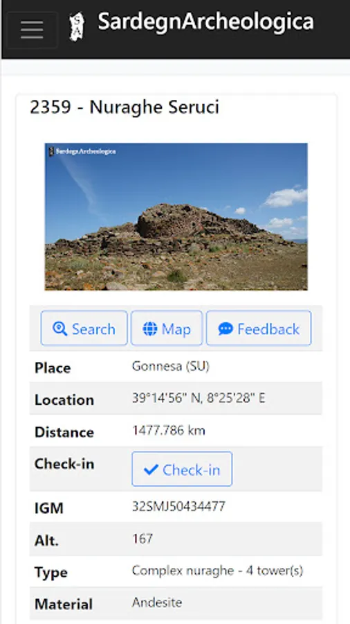 When online you can also navigate directly to the Nuraghe Map which will show your position but only when you are in Sardinia it will also show the locations of the nuraghi near to you. From the Nuraghe map you can open the Details page for a nuraghe.