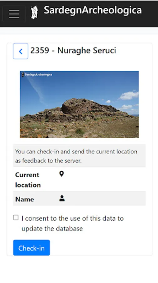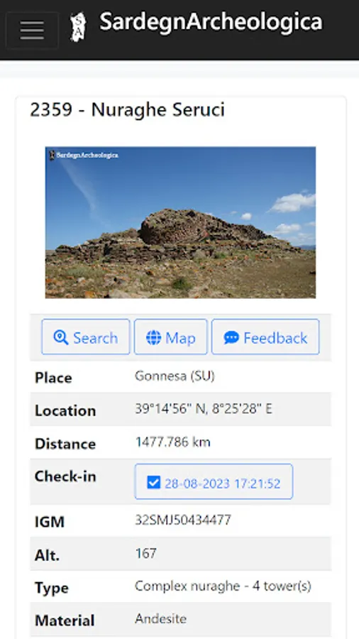 This Nuraghe app has been developed to work as a kind of site navigator for the over 6000 nuraghi that have been documented so far on the Nuraghe map of Tharros.info. It makes use of a local database to store the core information of the sites. This local database has to be updated the first time you use the app to retrieve all the entries. Using the Search page you can search the nuraghi by name or by place. On the Details page the core information is shown, and when online additional information and an image are available. From the Details page you can visualize the position on the Nuraghe Map when online. If you are near the structure you can check-in, the date will show next to the distance once you have checked in, and you can send a feedback to correct the geolocation of the monument.