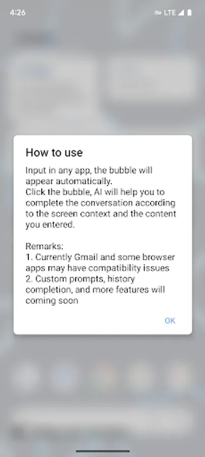 - In order to provide the chat function, it needs access to the Accessibility service to read the screen context. The content will be encrypted and sent directly to the OpenAI or to the proxy address that you have manually set.