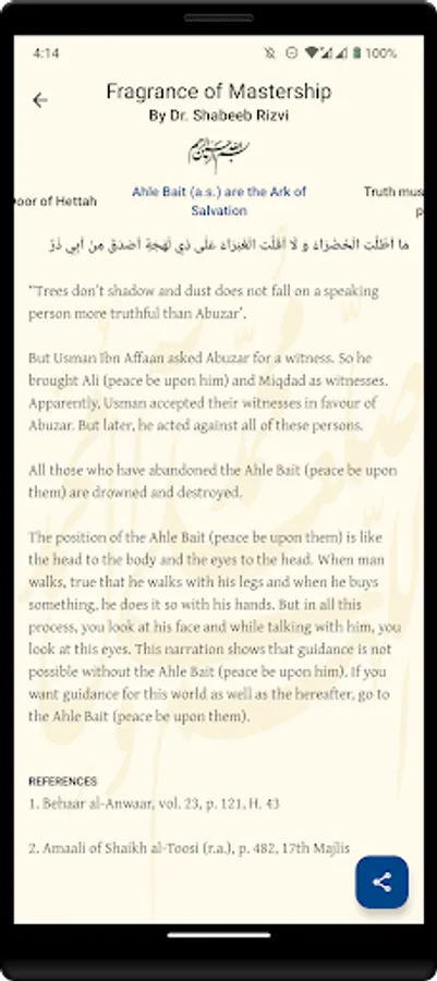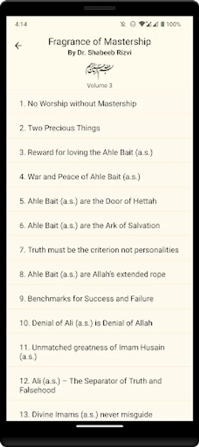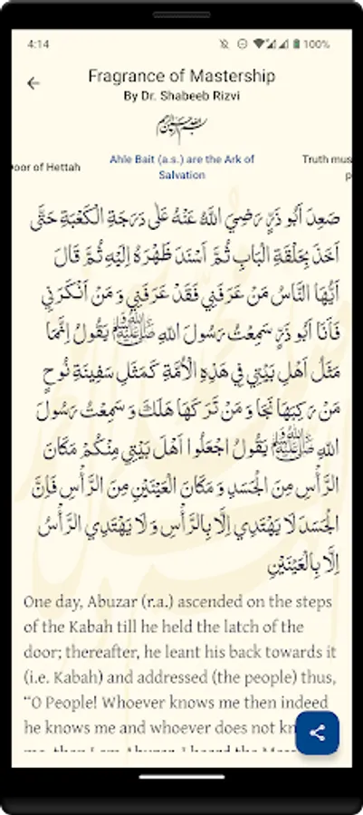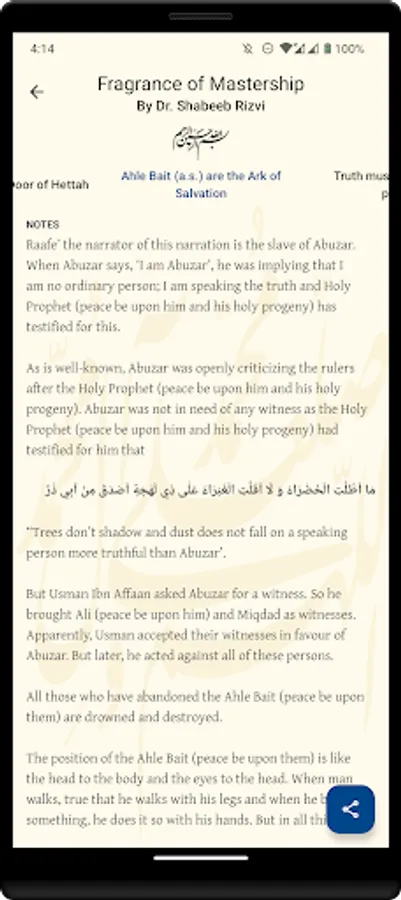 Fragrance of Mastership by Dr. Shabeeb Rizvi is a collection of traditions on wilayat (mastership) of Prophet Muhammad's (saws) successor, Amir al-Mu'mineen (as) and the 11 Imams. It also focuses on traditions regarding Holy Prophet's (saws) daughter, Lady Fatima Zahra (sa).
