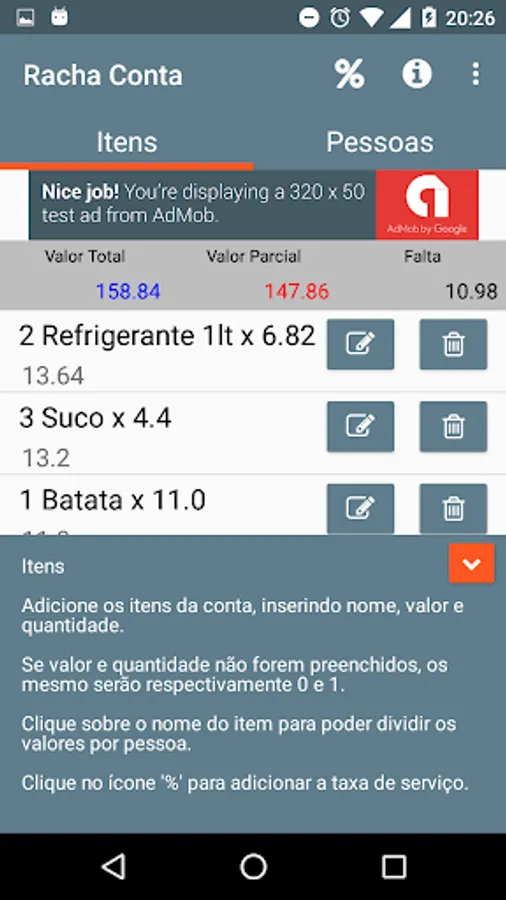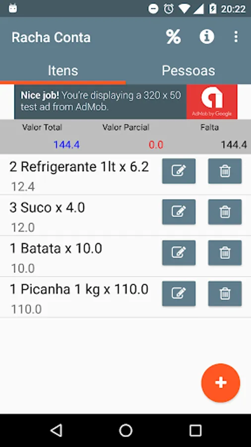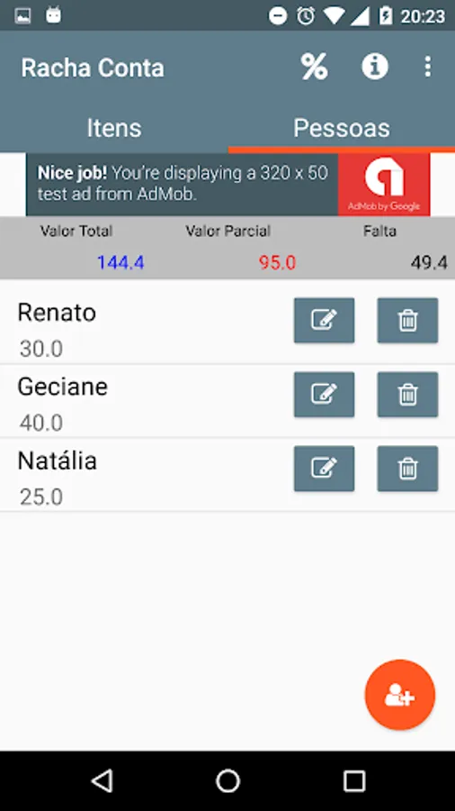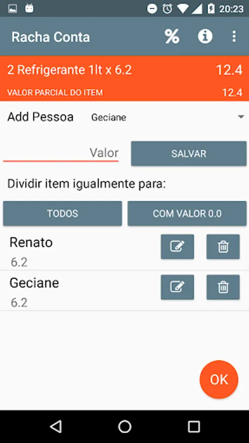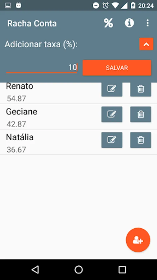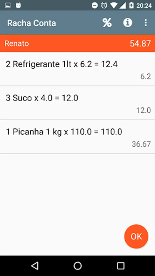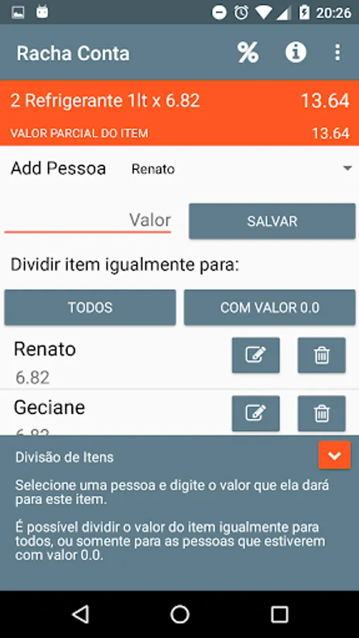 Add items in the account, or just an item with the full amount, add the people who will pay the bill and manage your account division.