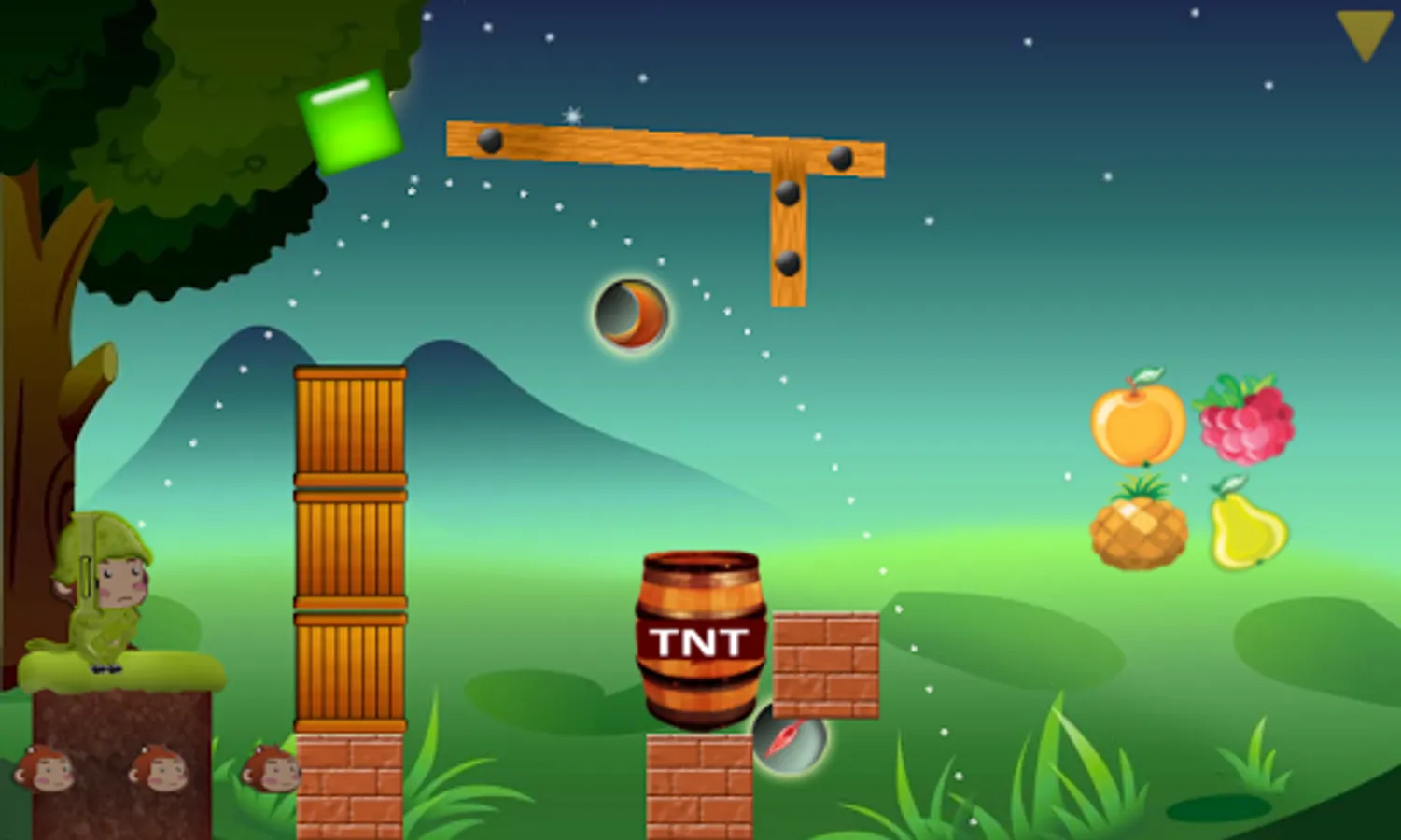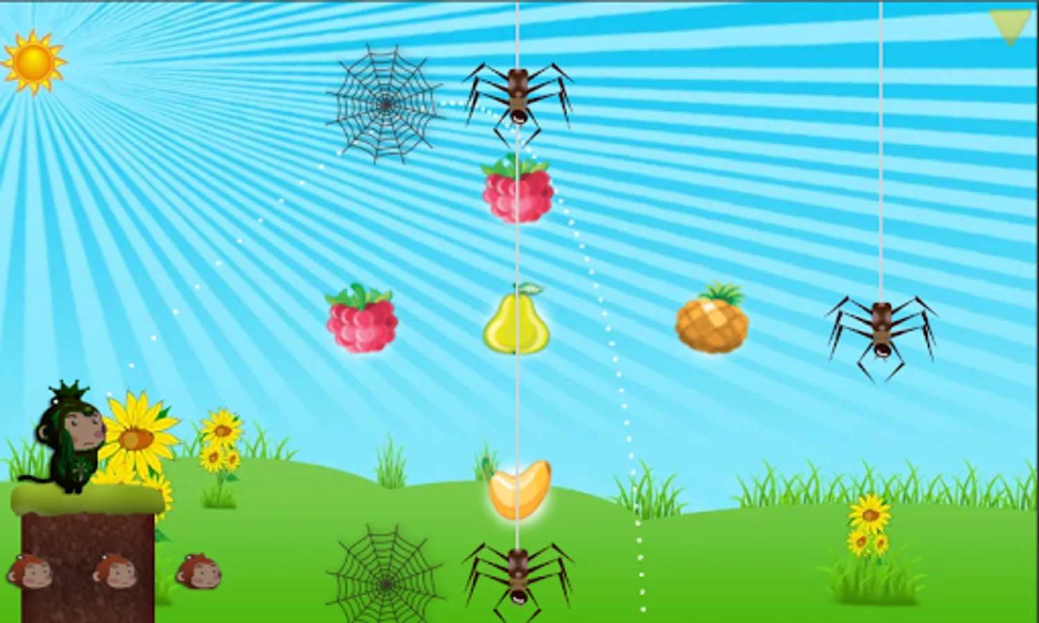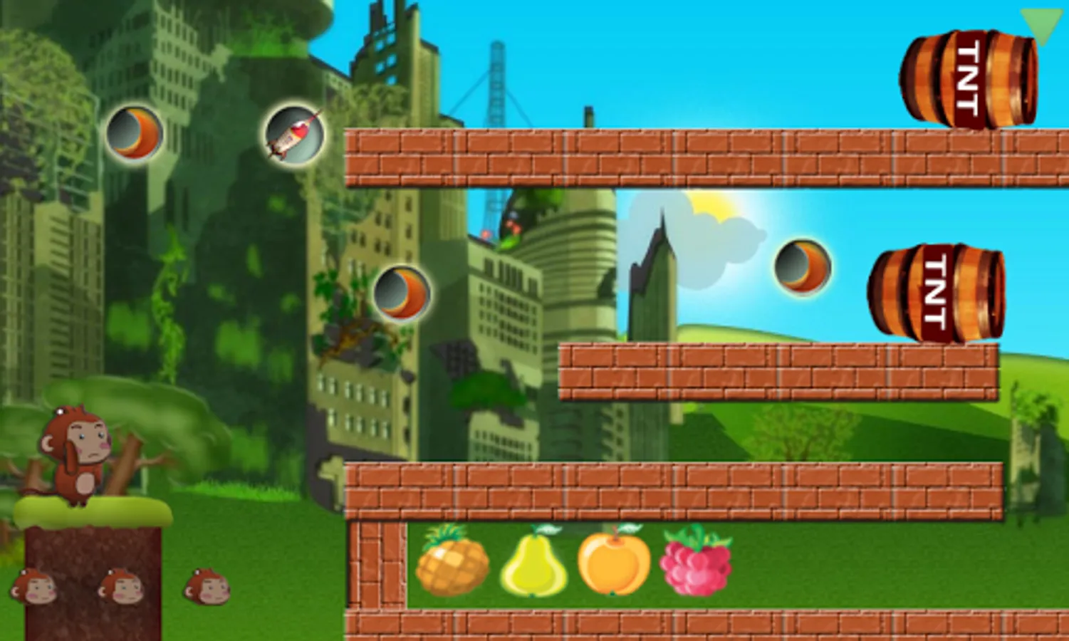 In the year 2525, Antarctic ice sheets collapse and global sea levels rise by 13 feet. The last surviving monkey family finds an island previously untouched by humans. They use their creative skills to find food. Please help the monkey to use various tools and weapons to find food.