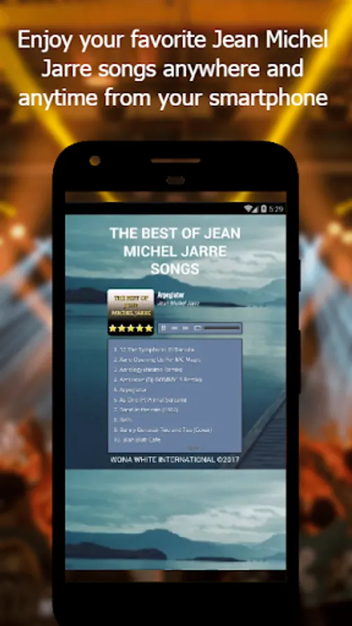 Thanks to this Jean Michel Jarre Songs application, you will have the opportunity to listen the most popular songs from Jean Michel Jarre in one click instantly and with good quality. Jean Michel Jarre Songs App brings you the best songs from Jean Michel Jarre. With this, you will enjoy listening to online Jean Michel Jarre music on your android, no matter where you are. Best of all, you get to access all this for free with this Jean Michel Jarre Songs App