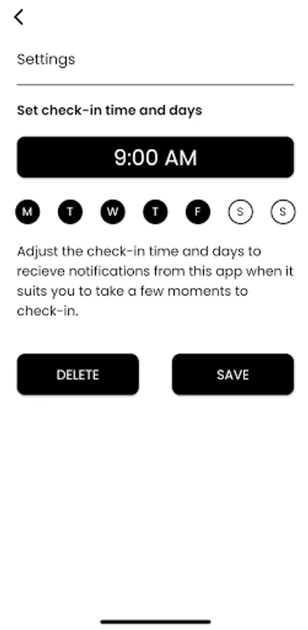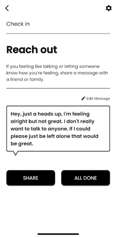 This app is designed as a simple tool to help remind you to take a few moments out of your day to check in with how you're feeling and to encourage you to reach out to a mate or family member to let them know how you're doing.