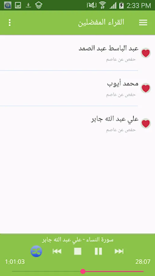 Holy Quran Audio library where include more than 800 reader with the ability to download and Sura or listen to it directly in addition contains a list of favorite and arrange the names of readers in ascending or descending order with the ability to search for names and Sura with ease and also the possibility of the participation of the sura with your friends or through social networking sites .