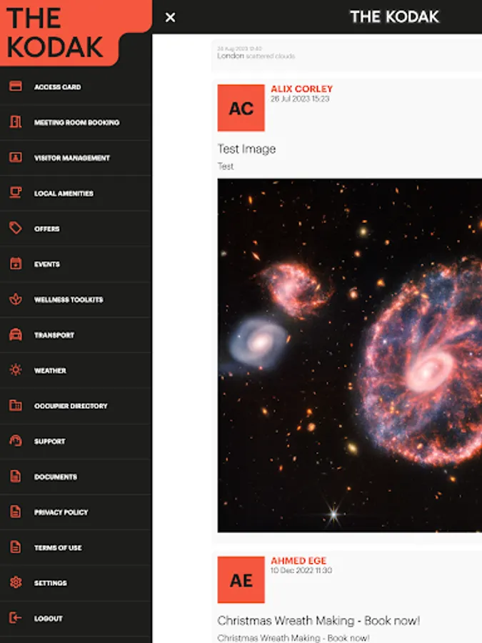 The Kodak keeps you in touch with your colleagues and working community. Access to social features through a scrollable “Social Wall” keeps you up to date with your colleagues, while in-app messaging is available from the “Chat” section. Occupants can look at real-time local events, amenities and offers to see what’s going on outside of the office.