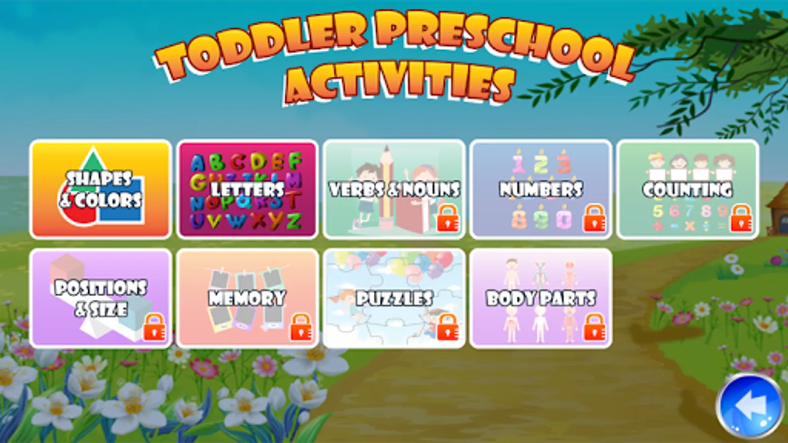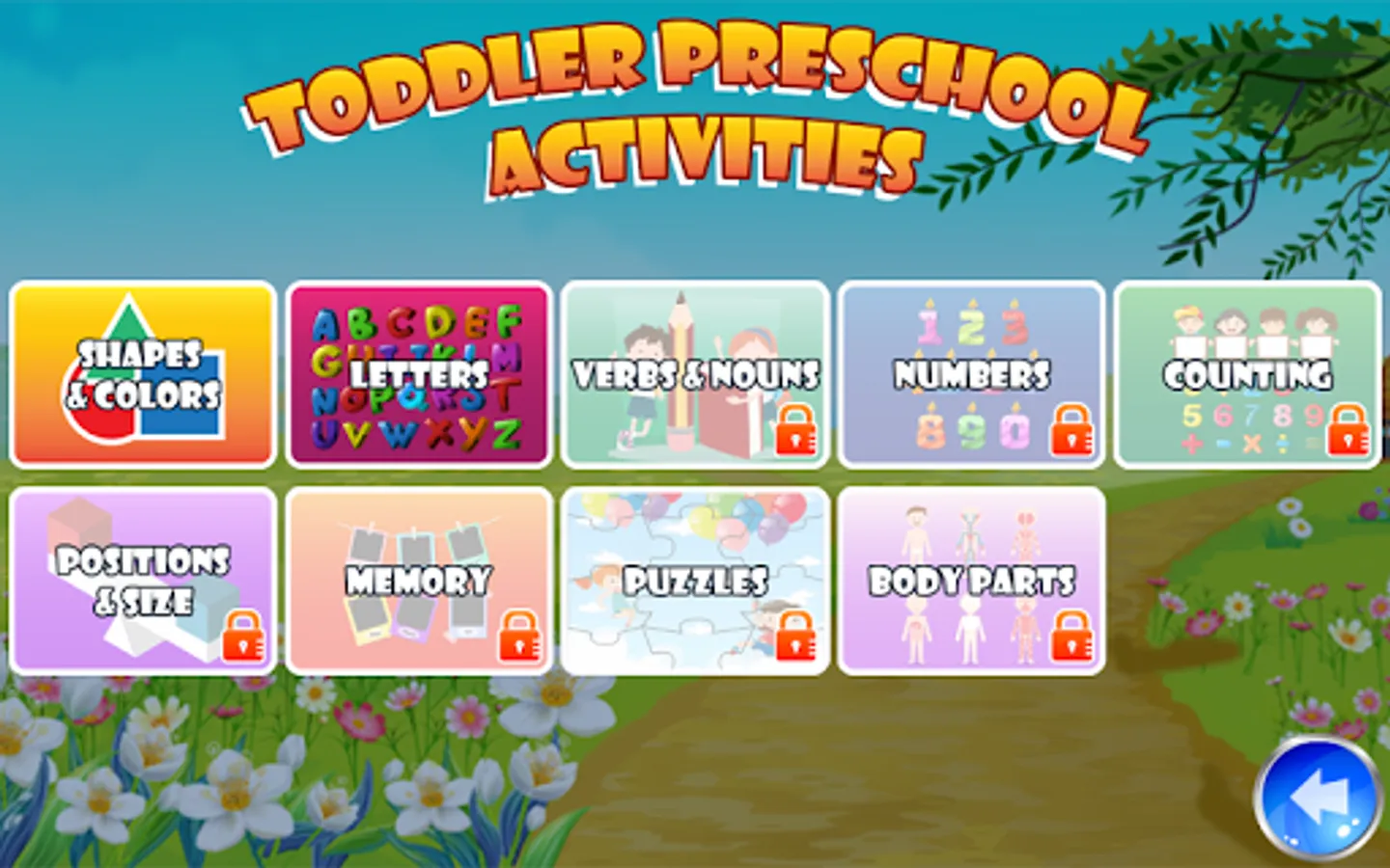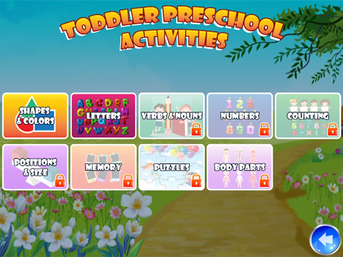 - The app includes 9 interactive educational games: Shapes & Colors, Letters, Numbers, Counting, Positions & Size, Verb & Nouns, Memory, Puzzles and Body Parts.