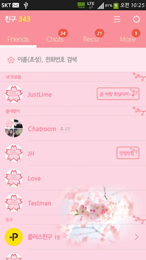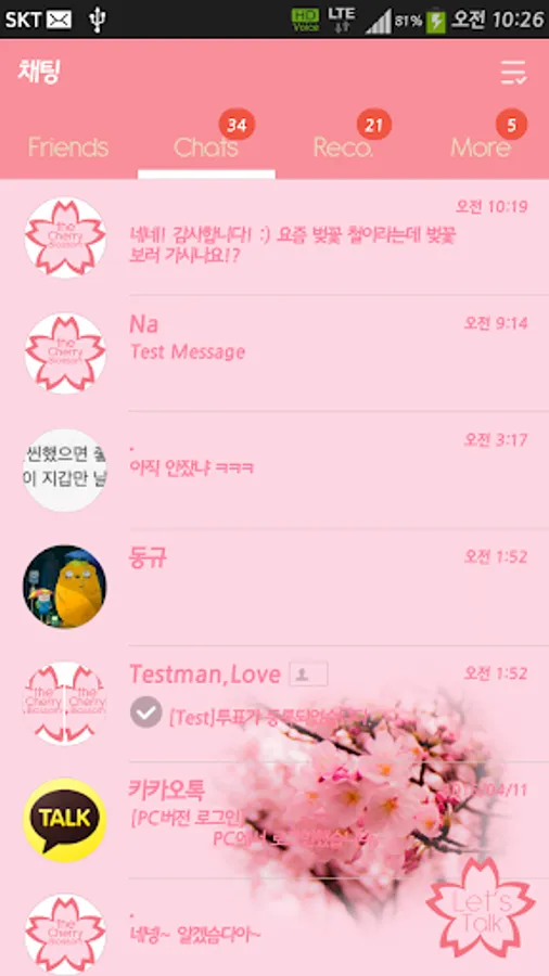 More after the execution KakaoTalk> Settings> Theme Settings> Locate the 'The CherryBlossom'