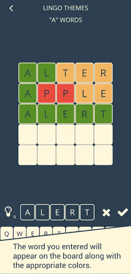 ◾ The word entered will appear on the board. Each letter of the entered word is highlighted on screen in a specific color.