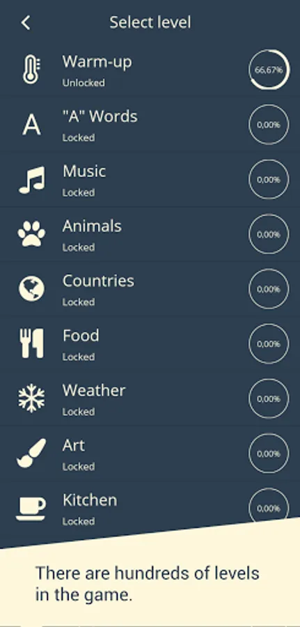 ◾ The game contains dozens of levels (themes). Each level is a dozen words to guess. You have to guess the words in order to unlock the next level.