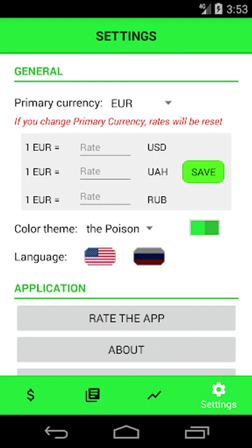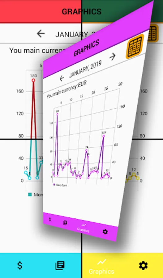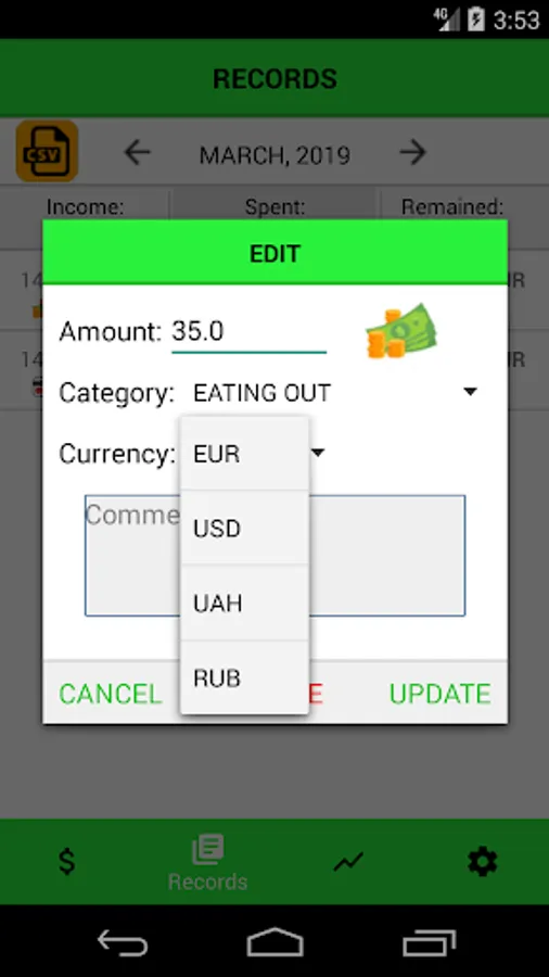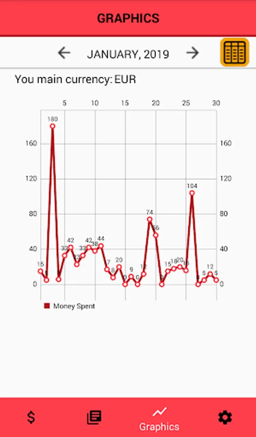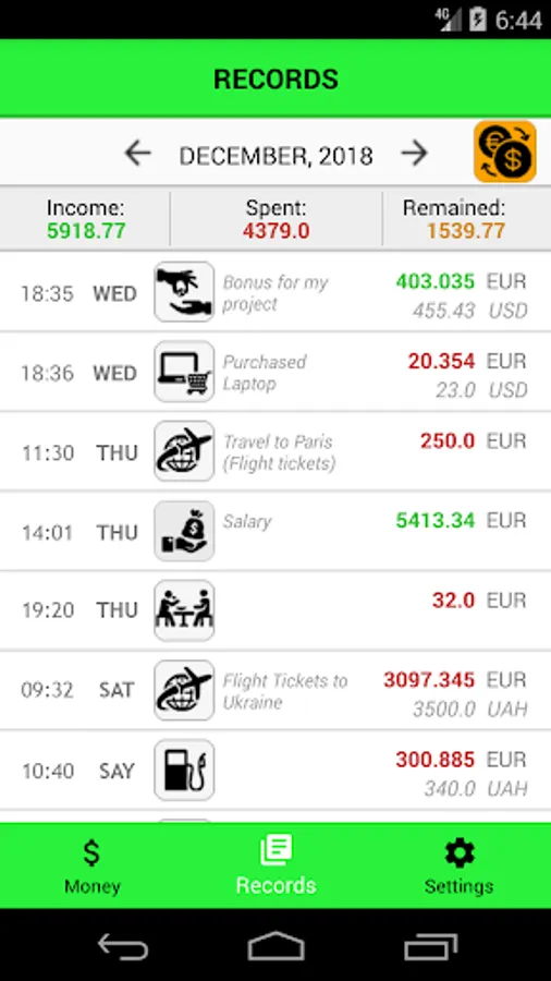 4 currencies are available: EUR, USD, UAH and RUB. If you use one main currency and register money in another, the application auto-converts it.