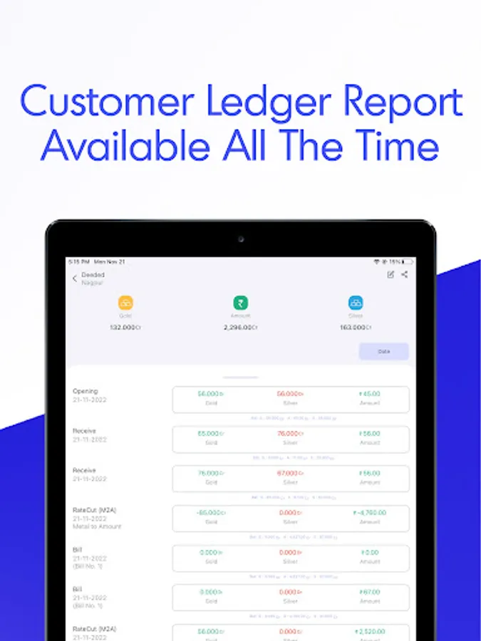 Albo-Wholesaler & karagir is ledger account book Mobile App which used by Wholesaler Jewellers and Jewllery Karagir.Albo having unique feature for Jewellers which is not present in another Accounting app like Rate Cut (Amount-Metal or Metal-Amount),Billing,Receive Gold or Silver,Payment Gold or Silver. They can able to track their every transaction with their client wise, date wise or metal wise. Each and every transaction can do by this Albo mobile Application with instant report generation with advance feature and data storage.