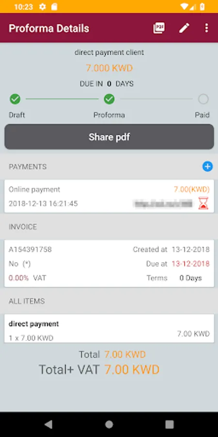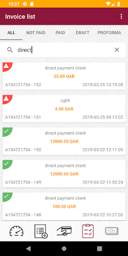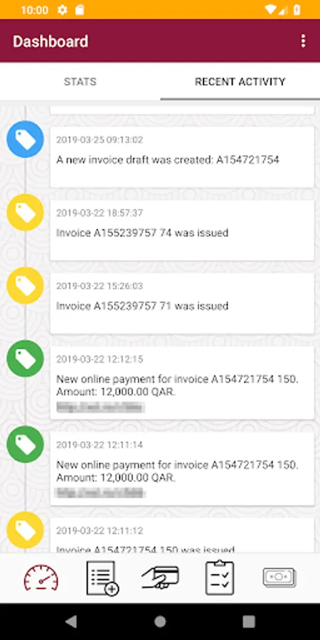 Paid and unpaid invoices created through the website and mobile app will appear on the dashboard.