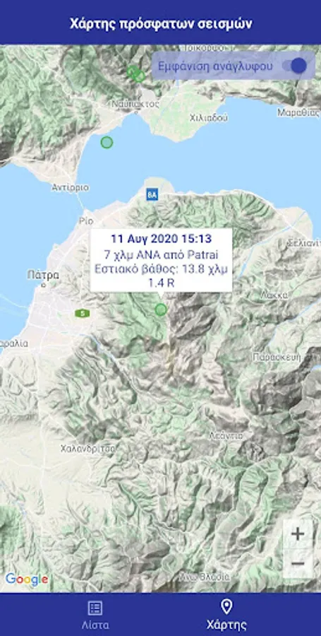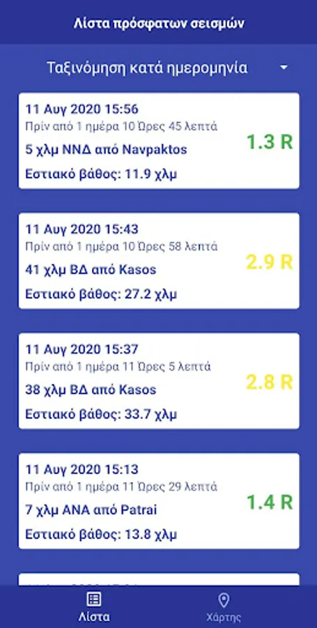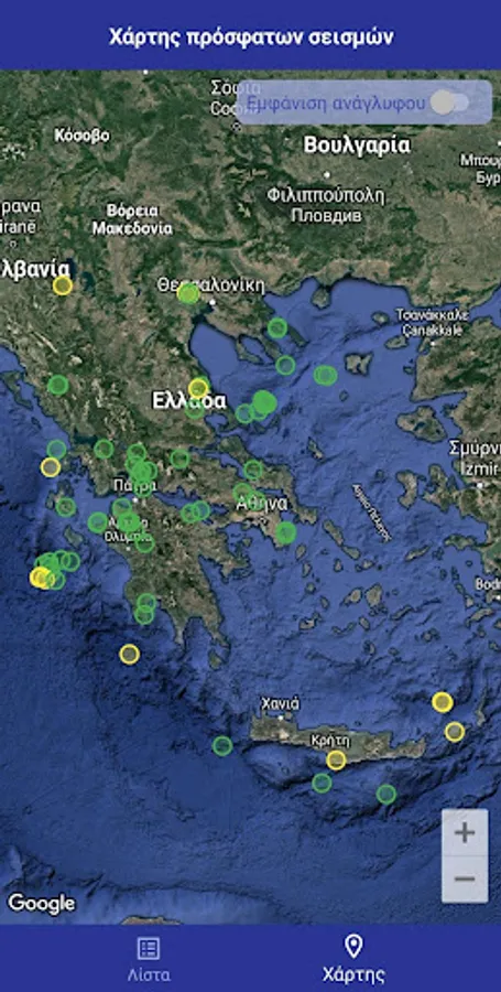 This app displays earthquakes that happened in the last 48 hours in Greece, available either as a list or positioned on the map.