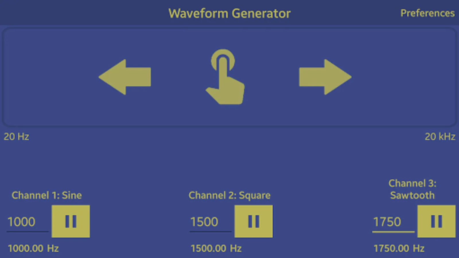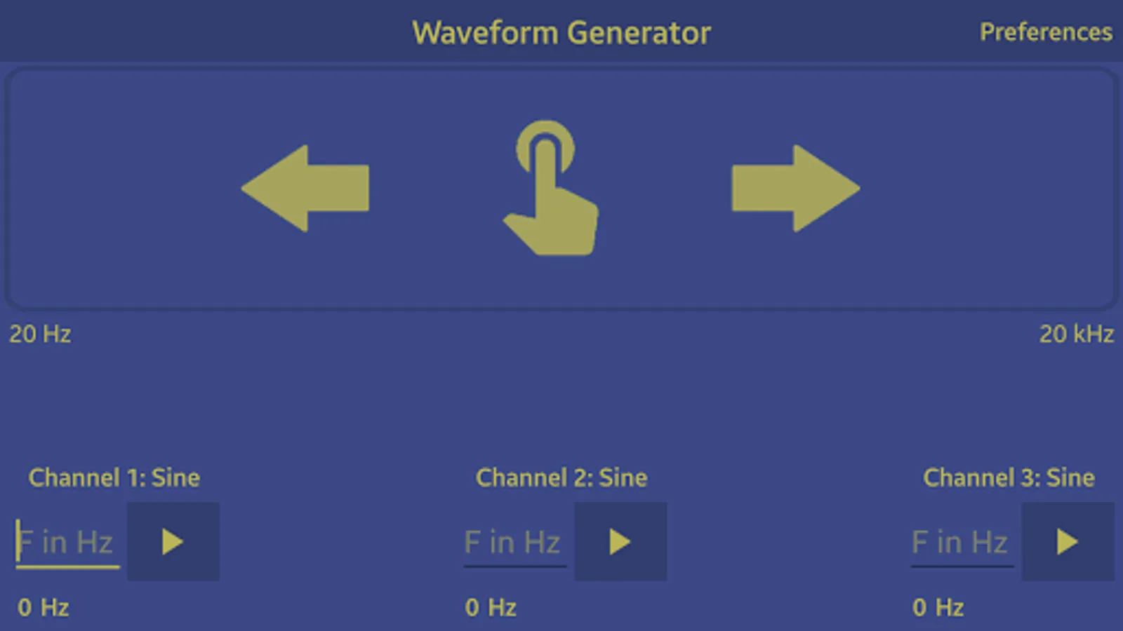 Either set a specific frequency and have it play constantly, or dynamically change the output frequency by swiping your finger on the upper half of the screen.