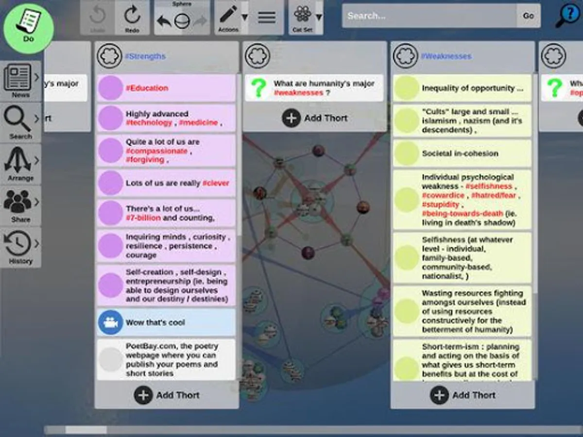 Initially the Mobile versions of the Thortspace App were thought to be a supporting addition to the Desktop versions. For example if you were out and about you could add some Thorts to a sphere when they occured to you, but then wait to get home or back to your office before you really put those Thorts into the places where they belonged, edited your Categories or Arrangements and considered their connections with Paths.