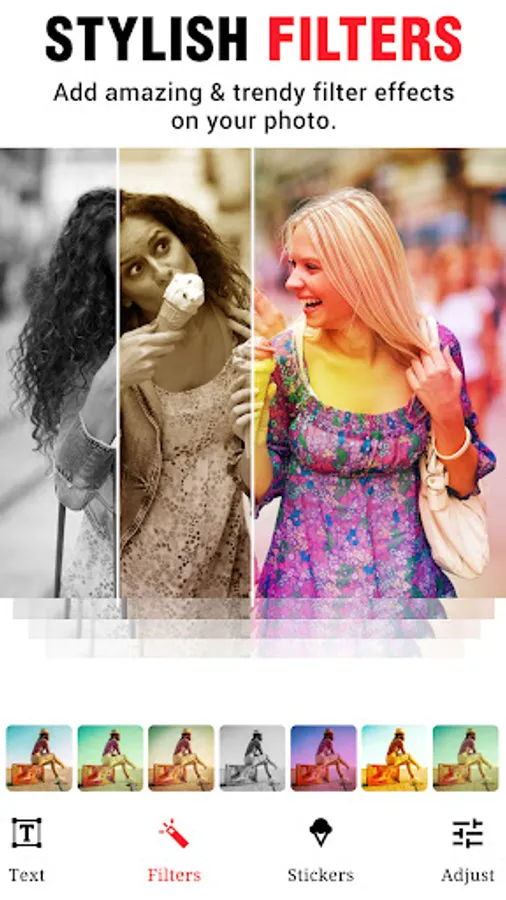 Add a catchy text to the cover photo album maker by choosing font color, font type and font size using this end card maker. Select awesome stickers for the photo cover to make it look beautiful with this intro maker & movie poster maker free app. Also apply filters like setting the brightness, contrast, saturation, effects to the create photo album maker beautiful and attractive.