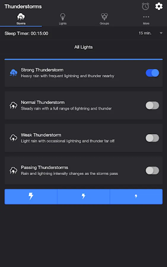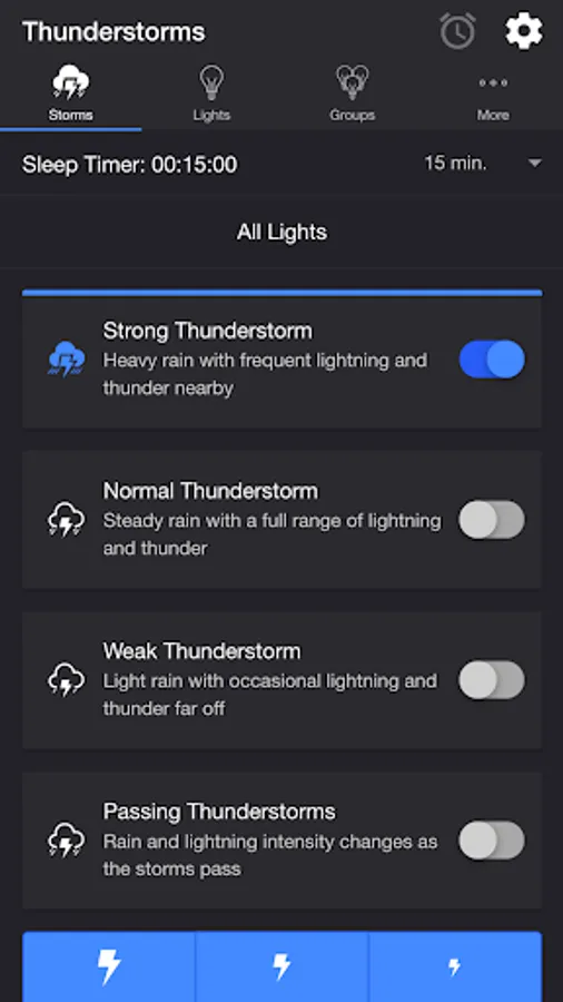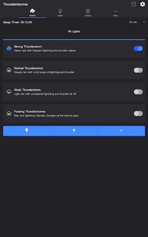 • Lightning on demand. Start a storm and tap one of the lightning buttons at the bottom of the page.