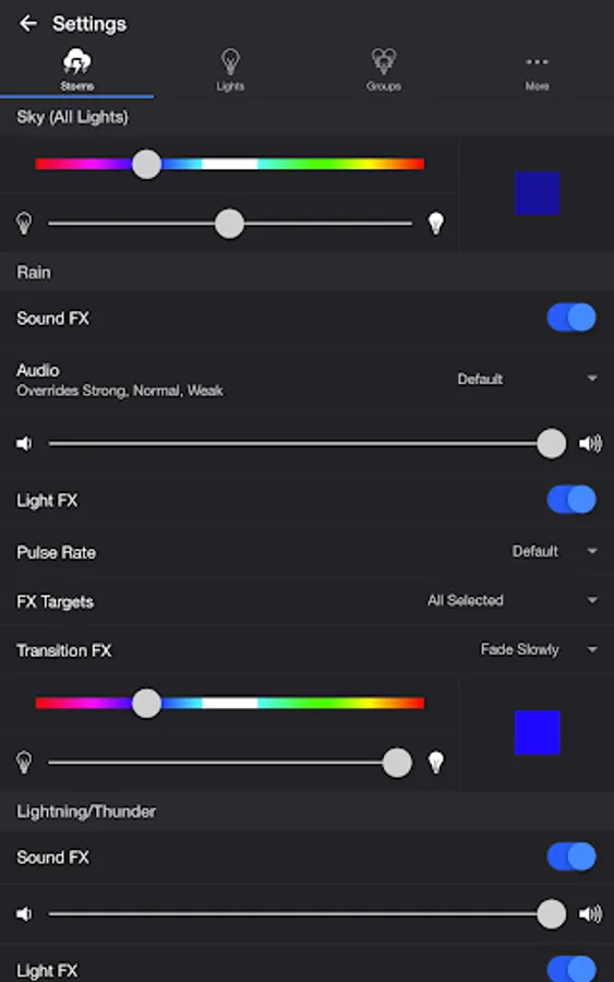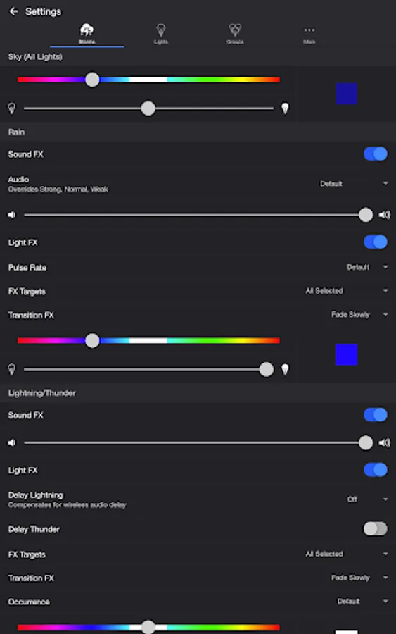 • Change lightning transition effects (random, pulse, fade quickly, fade slowly, flicker)