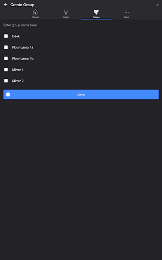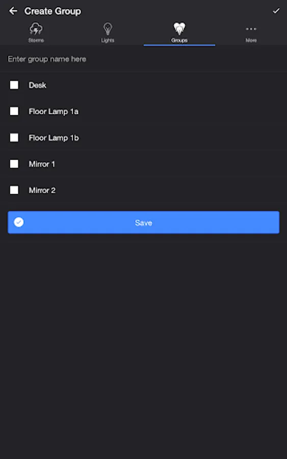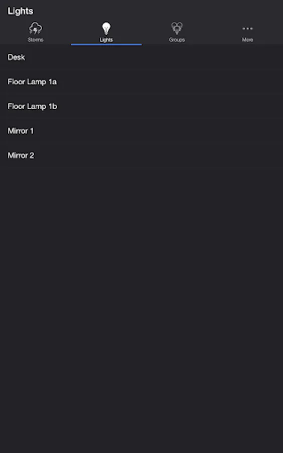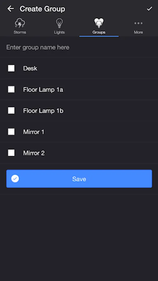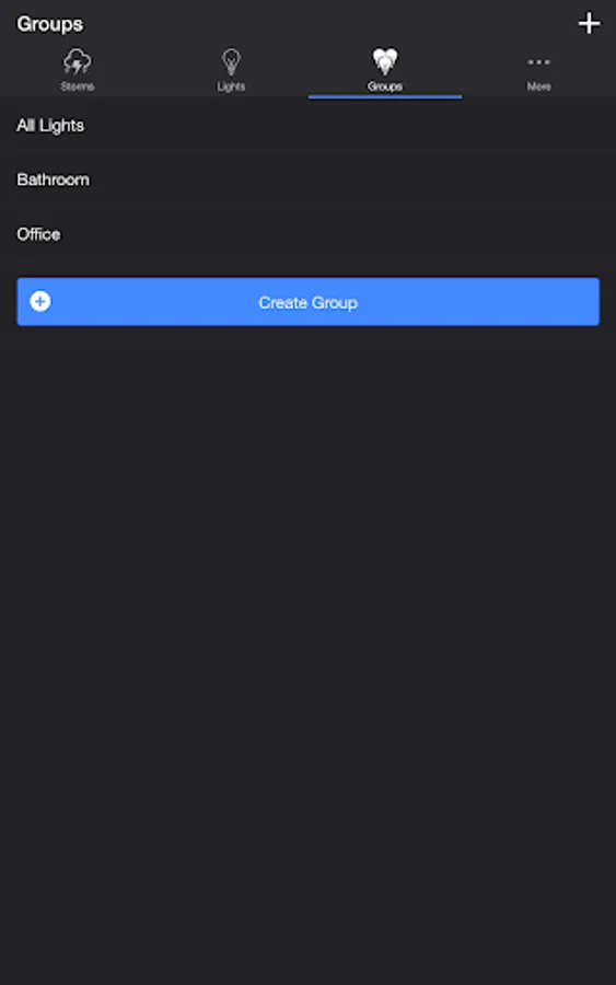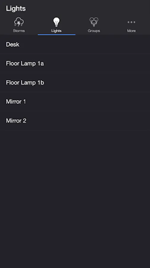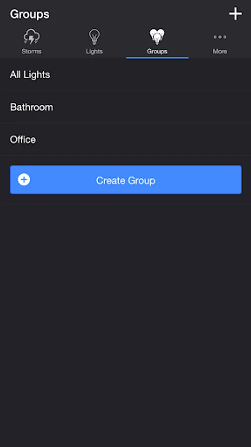 Select one or more lights for your thunderstorm light show on the Lights/Groups tab. Choose a group that you set up using your LIFX app, or create a new group in the Thunderstorm for LIFX app. To edit an in-app group in the list, swipe the item to the left and tap the pencil icon. When you add, remove, or change lights, pull down the list to refresh.