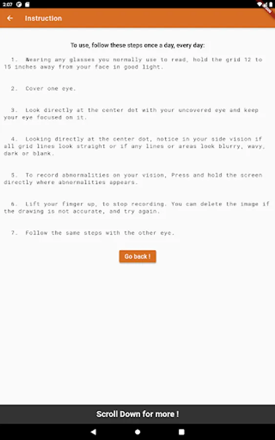 If you are diagnosed with AMD (Age Related Macular Degeneration) this application is a great but simple tool for you to make daily testing to record any signs of changes on your vision.