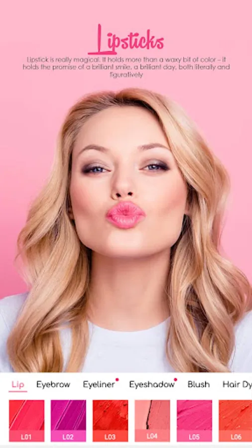 Lipstick color selection with different shades for lip makeup allows you to change the color of your lips. Different lipstick colors have been introduced to the app so that you can apply different shades to your lips in images if you forget to put on lipstick before shooting photos.
