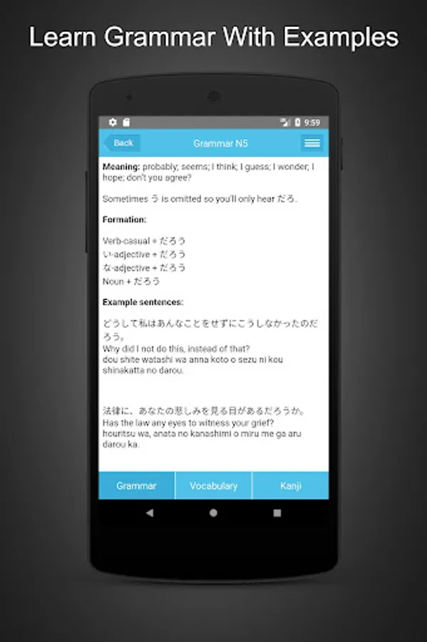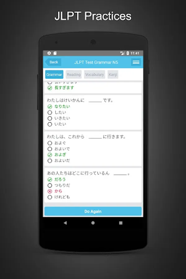 JLPT Learning & Testing is one of the best Japanese learning applications at present for practicing JLPT for all levels from N5 to N1.