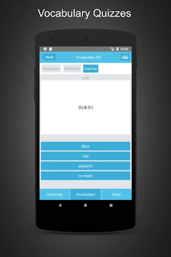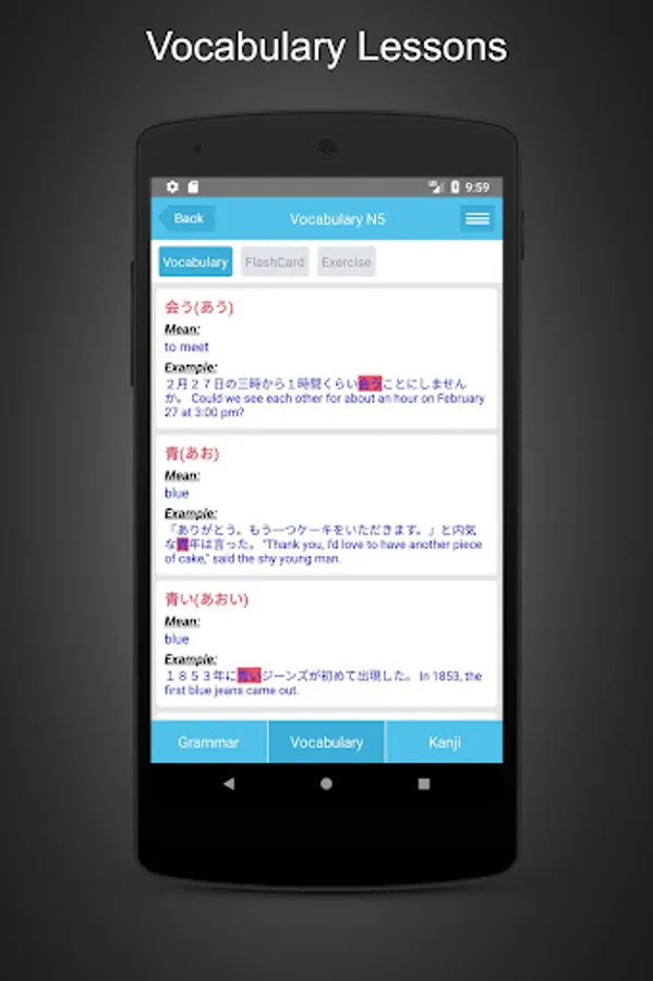 In the vocabulary section you can learn Japanese vocabulary (Japanese words) through flashcards and vocabulary quiz will help you practice and remember longer.