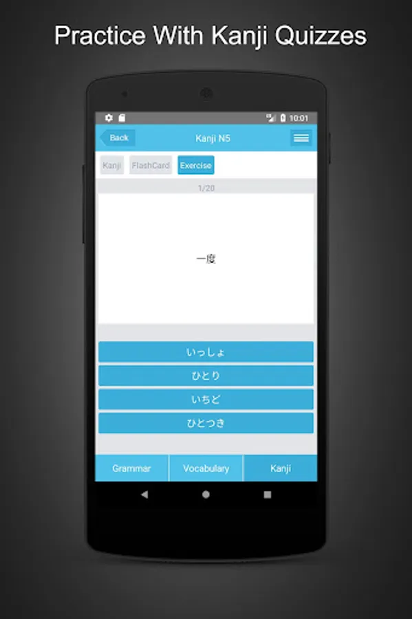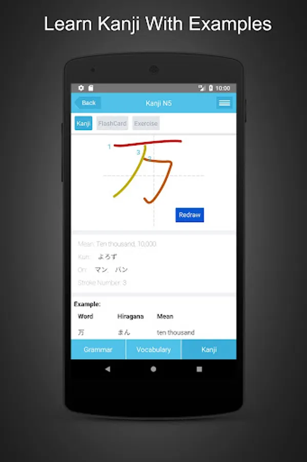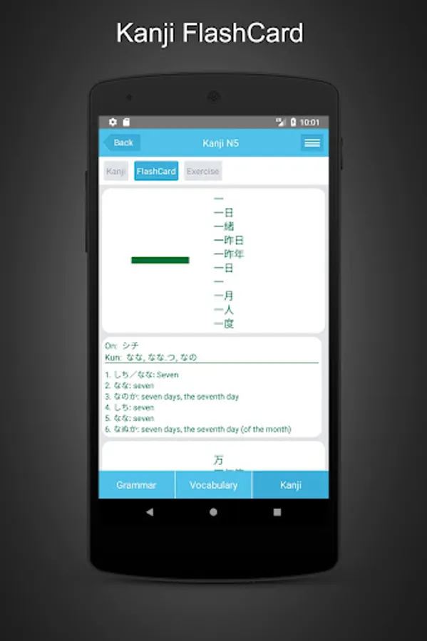In the Kanji section you can learn about writing, -kun and -on pronunciation through examples. Especially with Kanji flashcards will make it easier for you to learn and remember, after each lesson will have quizzes exercises for practicing.