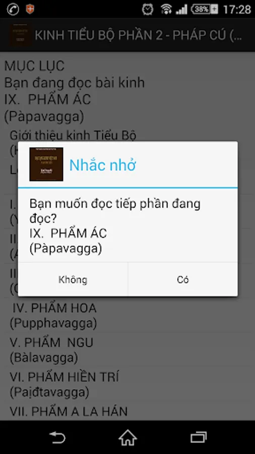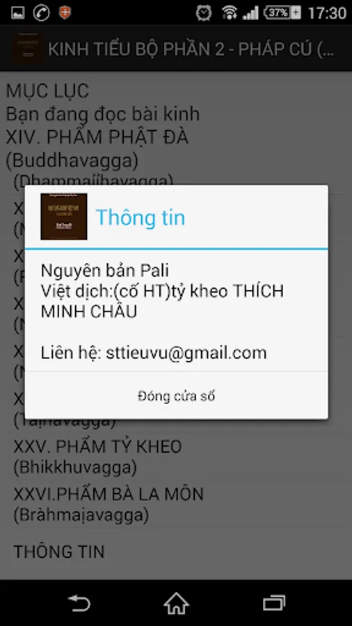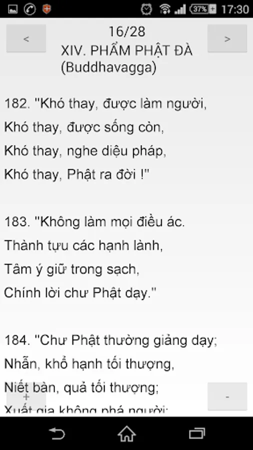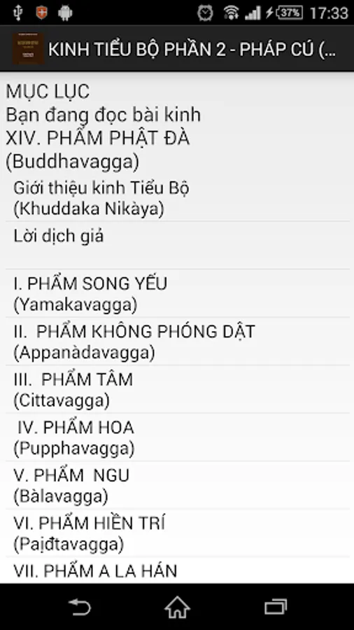 Dhammapada is a collection of 423 verses spoken by the Buddha in various occasions, during the 45 years of his preaching Dharma. The verses are all arranged in 26 products, due to the disciples arranged in Congress and reciting sutras The first episode after the Buddha. Each stanza contains a content studied very deep and rich, could not only read once that is understood. Need to read it again and again, searching the glossary, and heuristics from the enlightenment through self-realization and if it is to comprehend the meaning of the noble teachings. Each poem is a beautiful inspiration, a new path, a magical powers to help us have a stronger belief in the learning path toward enlightenment, liberation. (...)