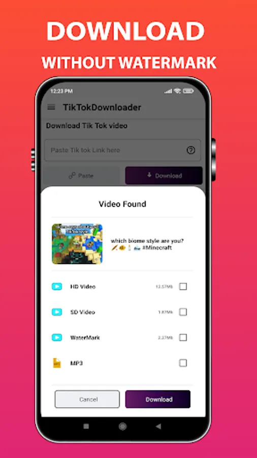 * Choose your preferred video quality (HD or SD) and click "Download" to save the video without watermarks to gallery.