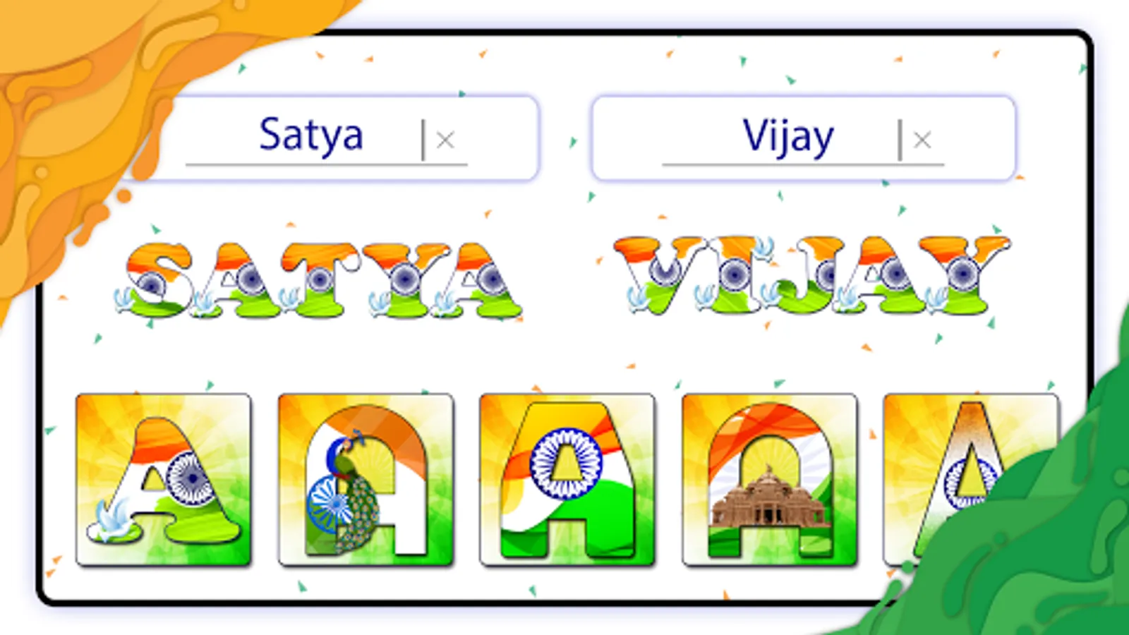 Indian Flag Name Maker 2020 app providing you A to Z Indian flag awesome letters/Alphabets with 4 different format. Proud To Be Indian Greeting Card With Custom Photo and Name Generator. Offline Indian Flag Frame With Photo Maker. Make Your Photo Frame Offline.