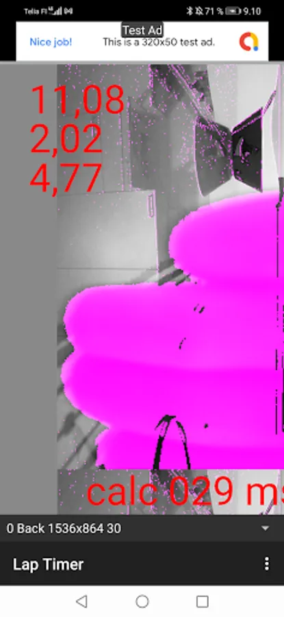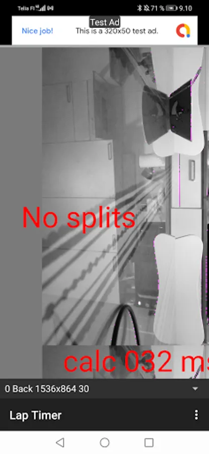 The app uses one of your phone cameras to measure lap splits. After initialisation of about 1 s, the video stream is monitored for changes, and the duration between substantial changes in the feed is shown on the screen.