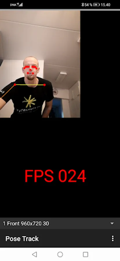 1. Select, which camera and resolution to use using a dropdown menu. The app opens with the first identified camera. Test using a low resolution like 720 x 720 to get near real-time pose estimates