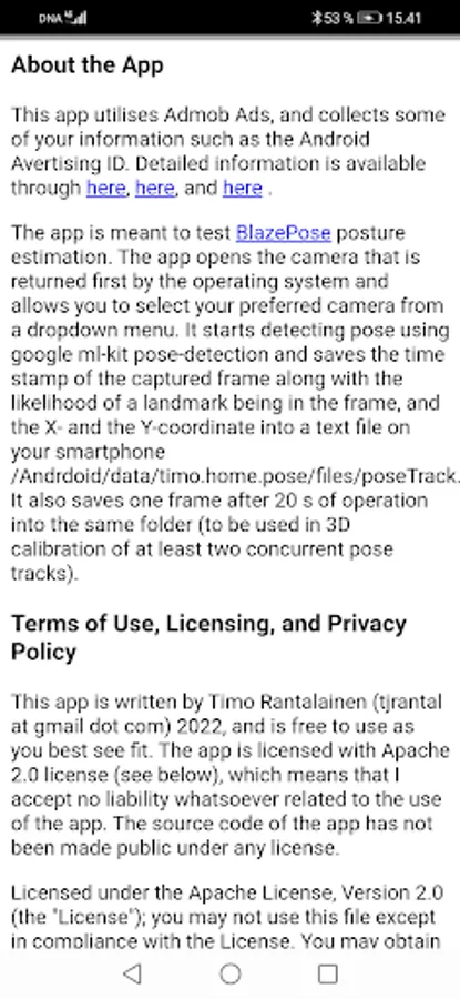 An app that enables testing markerless pose estimation with your camera. The app uses Google's ml-kit (machine learning toolkit)[https://developers.google.com/ml-kit] and detects anatomical landmarks to estimate the pose of the most prominent person in the camera feed.